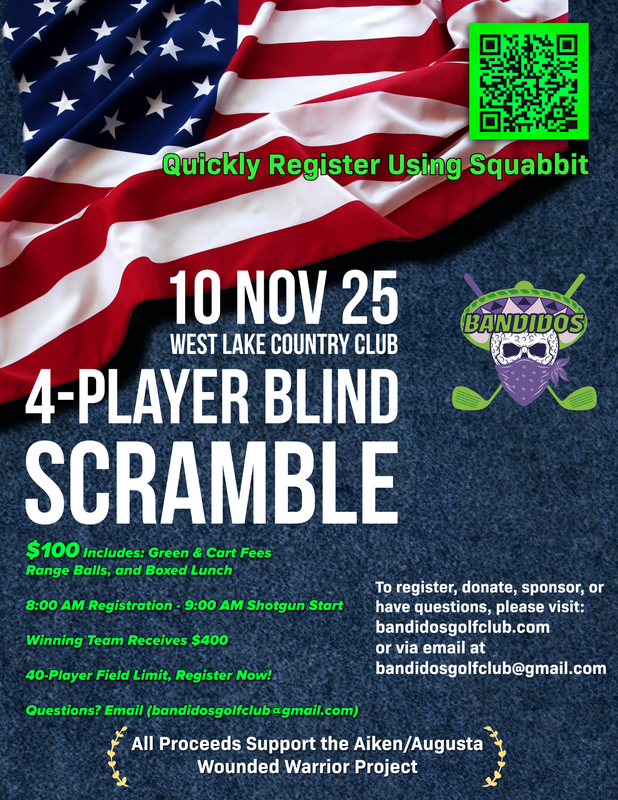 This is a 4-player blind golf scramble. That means that you can register as a single or play with your friends, the catch is that it doesn't matter who you play with, you will not know who your true teammates are until after the round. It works like this, all registrants are allowed to play with who they choose; however, all registrants are placed into one of four flights based on their handicap (GHIN not required but helpful). Once the round has begun, teams will be randomly generated, with the team comprised of one player from each flight. The teams now compete as stroke play (double-bogey max) where the winning team is based on the team with the lowest collective score. The prize for the winning team is $400 ($100 to each player). This ensures integrity amongst players and the overall event. All proceeds go to the Aiken / Augusta Wounded Warrior Project.